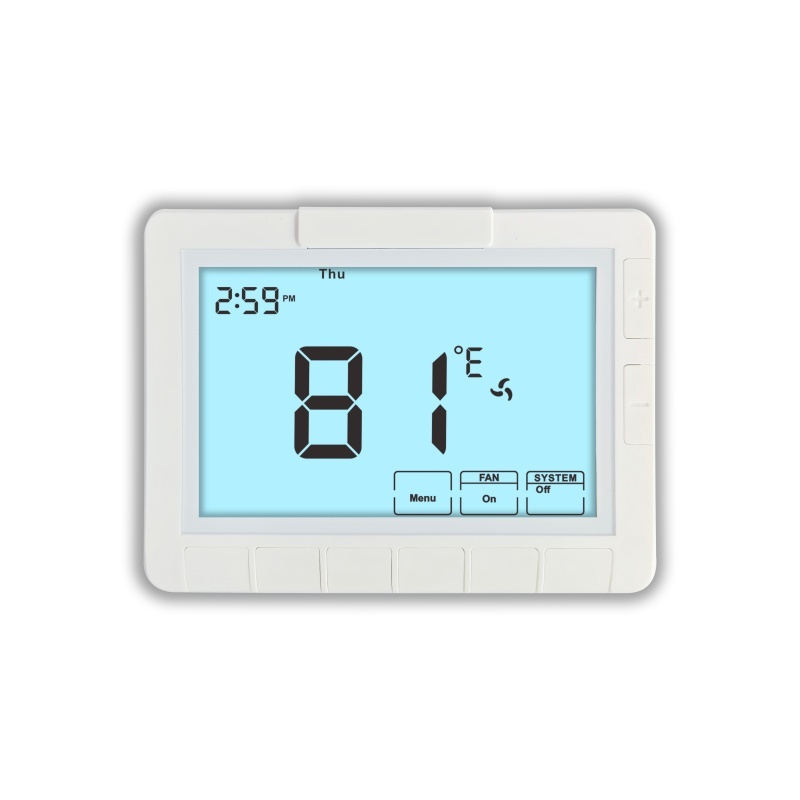 Il nostro termostato HVAC è dotato di più modalità di funzionamento del sistema, tra cui RISCALDAMENTO, SPENTO e RAFFREDDAMENTO, insieme alle modalità di funzionamento della ventola AUTO e ON, fornendo funzionalità versatili per qualsiasi ambiente. Il termostato vanta un display chiaro di 8,18 pollici quadrati e può essere alimentato da 2 batterie alcaline AAA o da un'alimentazione da 18~30 VAC NEC Classe II, 50/60Hz.